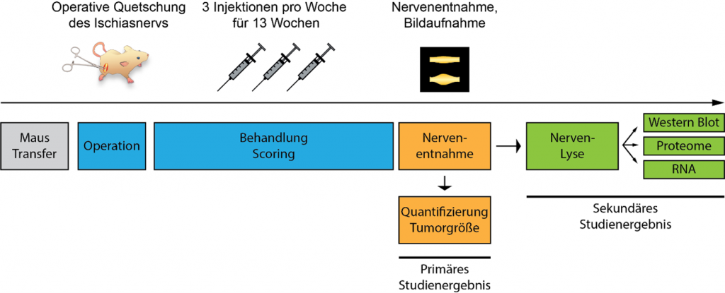 Die Wirksamkeit der Behandlung wird untersucht, indem die Größe des Ischiasnerv(tumors) (Primäres Studienergebnis) 13 Wochen nach Behandlung, beginnend 2 Tage nach der Nervenquetschung, gemessen wird. In einer anschließenden Analyse des Sekundären Studienergebnisses werden die Auswirkungen der Behandlung auf die zelluläre Zusammensetzung und den Differenzierungszustand mittels Proteom- und Phospho-Proteom-Analyse weiter umfassend untersucht. Ein Überblick des Studiendesigns ist in Abbildung 1 zu finden.