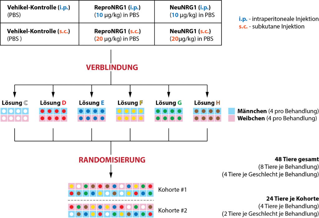 Das Hauptziel dieser Kopf-an-Kopf-Studie besteht darin, zu prüfen, ob NeuNRG1 ähnliche Wirkungen wie ReproNRG1 zeigt und somit die weitere gemeinsame Entwicklung einer NRG1-Proteinersatztherapie auf Grundlage der fortgeschrittenen Wissensbasis von NeuNRG1 rechtfertigt. Das sekundäre Ziel dieser Studie ist ein Vergleich der Applikationswege und der Behandlungsdosis, da NeuNRG1 von unserem Industriepartner routinemäßig in Form von (klinisch leichter zugänglichen) subkutanen (s. c.) Injektionen zu 20 mg/kg verwendet wird – im Gegensatz zu intraperitonealen (i. p.) Injektionen zu 10 mg/kg, welche in unseren früheren und laufenden Studien verwendet werden.