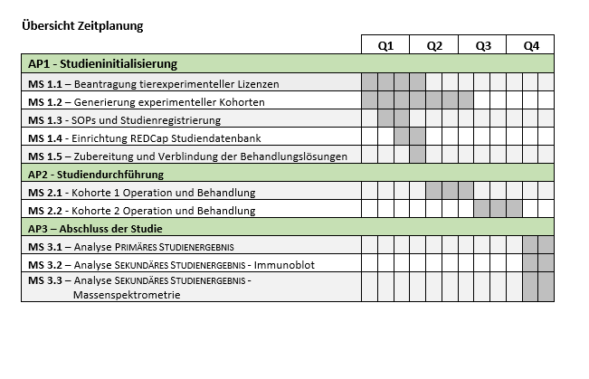 Die Studieninitialisierung umfasst die Antragserstellung und -einreichung für die benötigten Tierversuchsgenehmigungen (MS 1.1), die Generierung und genetische Charakterisierung der Versuchskohorten (MS 1.2), die Anpassung der Standardarbeitsanweisungen (SOPs), welche aus unserem präklinischen, multizentrischen Framework abgeleitet sind, und die anschließende Registrierung der Studie beim Tierversuchsregister des Deutschen Zentrums für den Schutz von Versuchstieren (Bf3R) (MS 1.3), die Einrichtung der REDCap-Studiendatenbank (MS 1.4) und die Vorbereitung der verblindeten Behandlungslösung (MS 1.5).