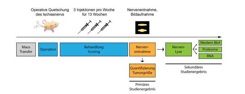 Das erste Forschungsprojekt befasst sich mit einer präklinischen Vergleichsstudie im Mausmodell, welche die Effektivität verschiedener Neuregulin 1 (NRG1) Proteinvarianten hinsichtlich einer Wachstumshemmung von Schwannomen im Vergleich zu einer Placebobehandlung untersucht. Ziel ist die beschleunigte Entwicklung einer NRG1-Proteinersatztherapie, die das Wachstum von Schwannomen hemmt und die Nervenregeneration verbessert.