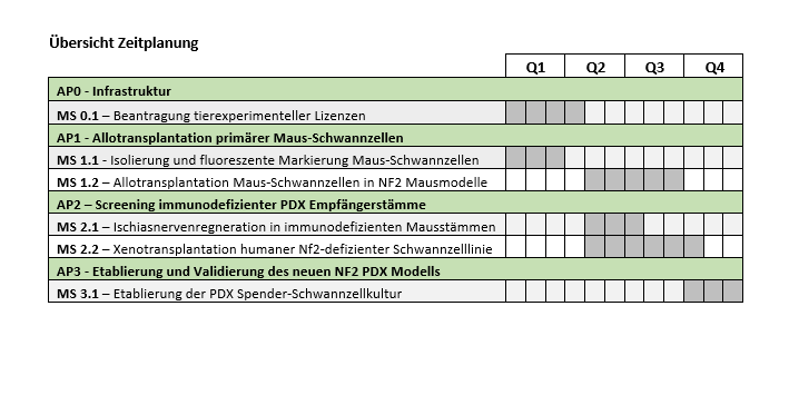 Insgesamt stellt sich hieraus die Notwendigkeit dar, ein neues NF2-PDX-Mausmodell zu entwickeln, welches auch die Auswirkungen der Mikroumgebung der Nerven berücksichtigt, um die bei menschlichen Patienten beobachteten Prozesse der Tumorbildung und -progression besser widerzuspiegeln. Zielsetzung und Arbeitsziele Die Entwicklung eines neuen NF2-PDX-Mausmodells folgt einem schrittweisen Arbeitsprogramm (s. u.), um die Machbarkeit eines derartigen NF2-PDX-Mausmodells systematisch abzuklären und seine Schlüsselfaktoren zu definieren. Hauptziel ist es, ein robustes und einfach zu verwendendes PDX-Mausmodell zu entwickeln und zu validieren, welches Wissenschaftlern zur Verfügung gestellt und an Industriepartner lizenziert werden kann, um das Screening neuartiger NF2-Therapieansätze zu ermöglichen und zu unterstützen.