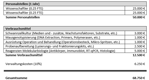 Budgetplanung Die vorgeschlagenen Arbeiten werden in unser etabliertes präklinisches Studienframework integriert. Wir werden die wissenschaftliche Infrastruktur und Expertise für dieses Projekt einschließlich eines dedizierten Projekt-(Meta-)Datenmanagementsystems, eines unabhängigen Studienmonitorings sowie Randomisierungs- und Verblindungsmaßnahmen (welche von einem zusätzlichen gruppeninternen präklinischen Studienmonitor durchgeführt werden, dessen Finanzierung in diesem Antrag nicht beantragt wird) zur Verfügung stellen. Um die vorgeschlagenen Arbeiten effizient und zeitnah durchführen zu können, ist es außerdem erforderlich, dass zwei erfahrene Wissenschaftler als Team zusammenarbeiten, insbesondere bei den Operationen und der Behandlung der Tiere. In der verbleibenden Zeit werden die Aufgaben je nach Bedarf innerhalb des Teams verteilt, um den Projektfortschritt zu beschleunigen.